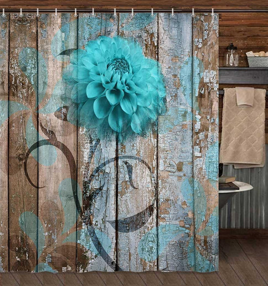 Farmhouse Flower Floral Shower Curtain, Rustic Teal Turquoise Dahlia Shower Curtain Set, Country Blue Wild Garden Plant Fabric Shower Curtain with Hooks, Surreal Bathroom Curtain, 69X70Inch
